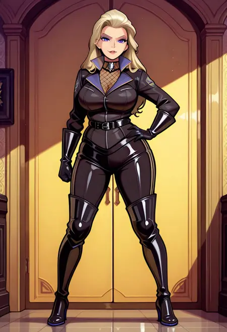 Karen, 1girl, jacket, gloves, black trousers, thighhigh boots, fishnet undergarment,