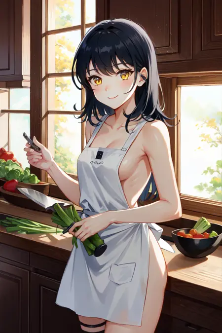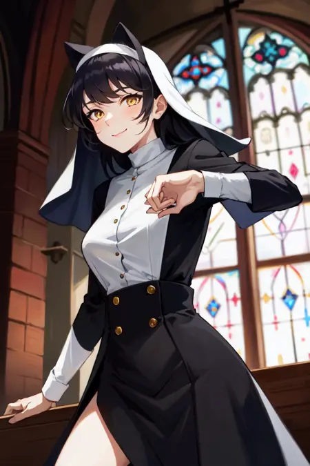 Belladonna、猫耳、ロングヘア、やや大きなバスト、黒髪、黄緑色の目