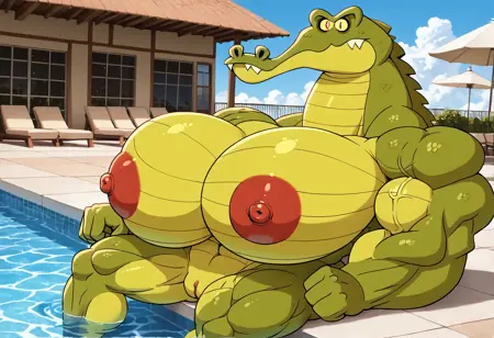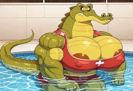 The appearance prompts are as follows: anthro, alligator, green body, yellow light underbelly, tail, red eyes, reptile eyes, slit pupil, female, 1girl