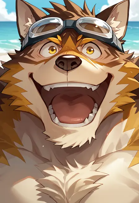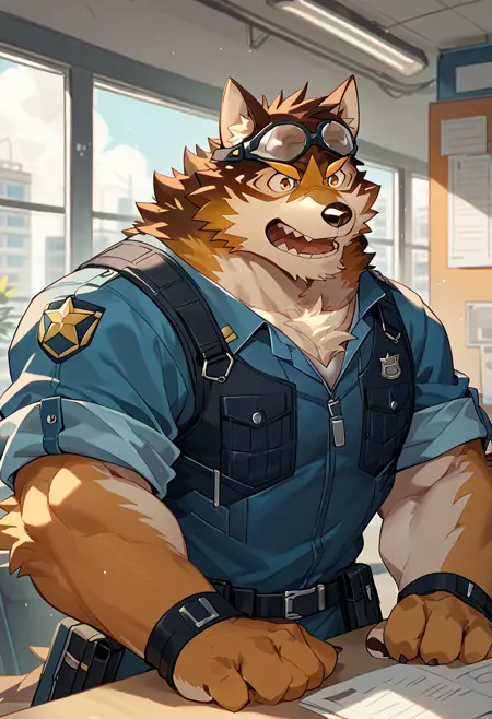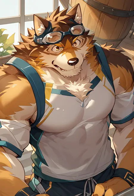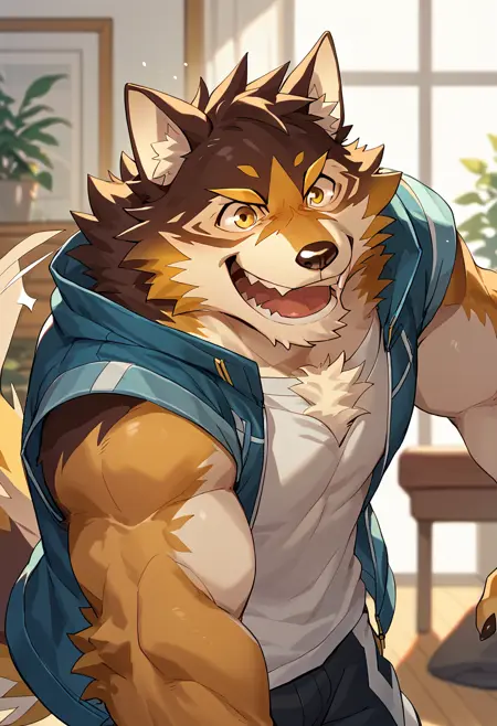 Illustrious: best quality, amazing quality, very aesthetic, absurdres, newest, b4rre1, live a hero, furry, furry male, muscular, 1boy, solo, dog boy, yellow eyes, ...your tags...