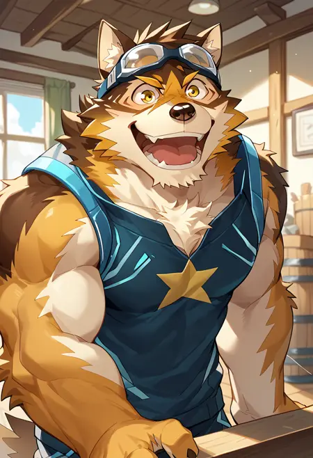 Pony: score_9, score_8_up, score_7_up, high quality, hires, solo, barrel, live a hero, furry, dog boy, muscular male, yellow eyes, ...your tags...