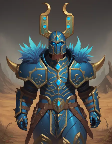 TzeentchCL, blue armor, full armor, helmet, cape, blue eyes, glowing eyes, gem,