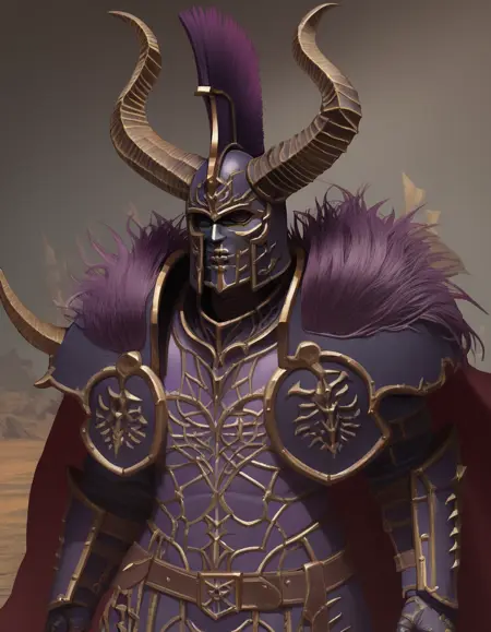 SlaaneshCL, purple armor, full armor, helmet, horns, cape,