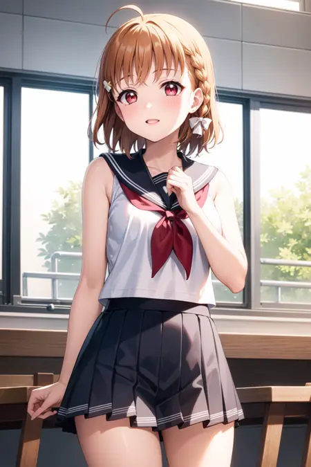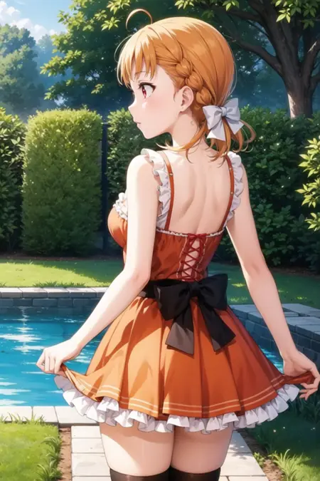 Tags you'll need: 1girl, solo, takami chika, red eyes, braid, hair bow, ahoge,