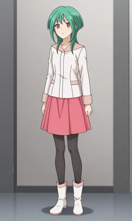 tokoha_w1,白色高领衫,粉色高腰裙,带纽扣的粉色裙子,黑色连裤袜,棕色靴子,吊坠,
