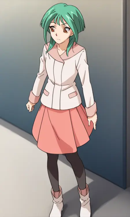 white wear, pink pleated skirt, black pantyhose, white boots,