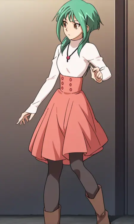 white turtleneck, pink high-waist skirt, pink skirt with buttons, black pantyhose, brown boots, pendant,