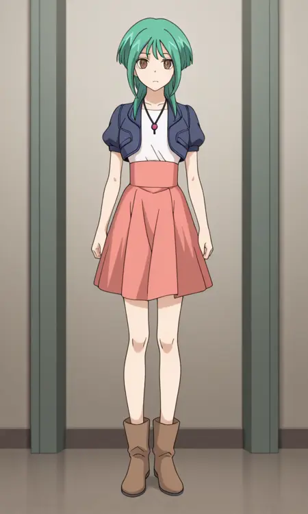 파란색 길이 짧은 재킷, 흰색 셔츠, 분홍색 치마, 갈색 부츠, 펜던트,