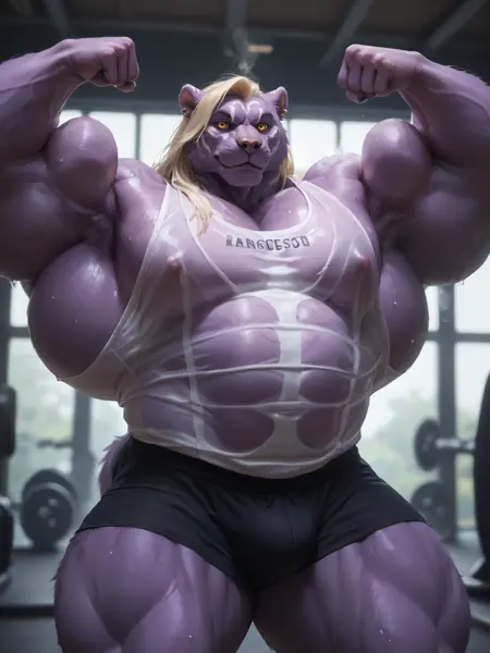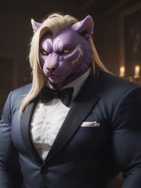 正面关键词:岚月、紫色身体、金色长发、黄色眼睛、耳钉、纹身