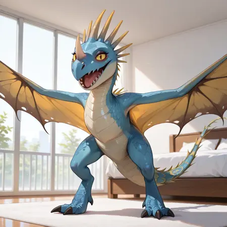 Stormfly/Deadly Nadder from the series How to train your Dragon. A mix of SFW and NSFW pictures were used, especially screen caps from the movies and series. Most pictures were however trained on Stormfly so there will be a bias in generation probably.