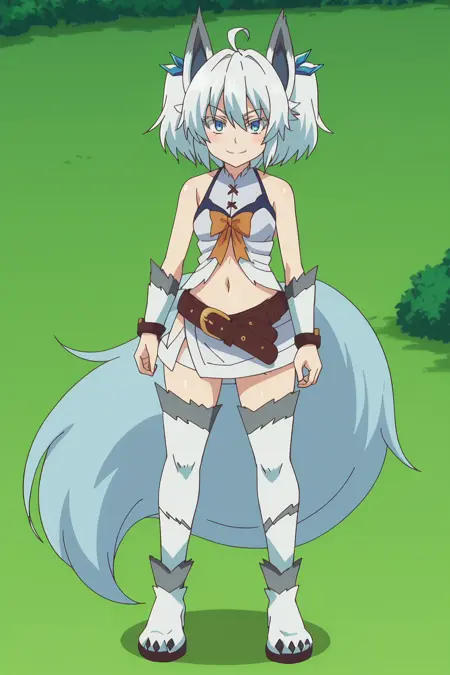 1girl, setsuna \(kaiyari\), kaifuku jutsushi no yarinaoshi, blue eyes, white hair, short hair, ahoge, twintails, hair ornament, wolf tail, wolf ears, colored eyelashes,