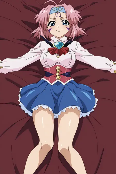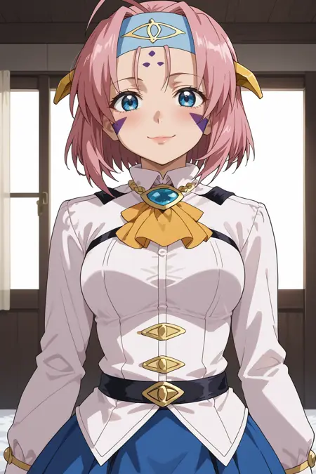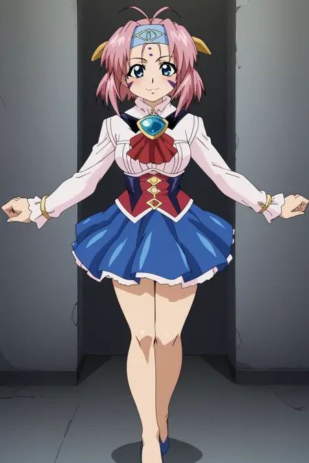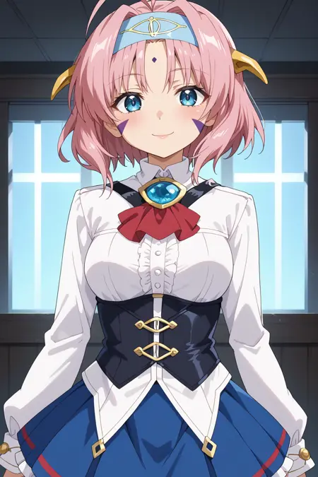 1girl, rati, viper gts, blue eyes, pink hair, short hair, facial mark, hairband,