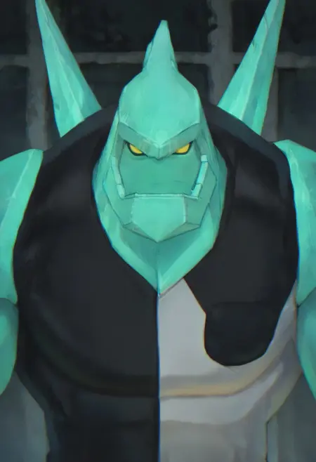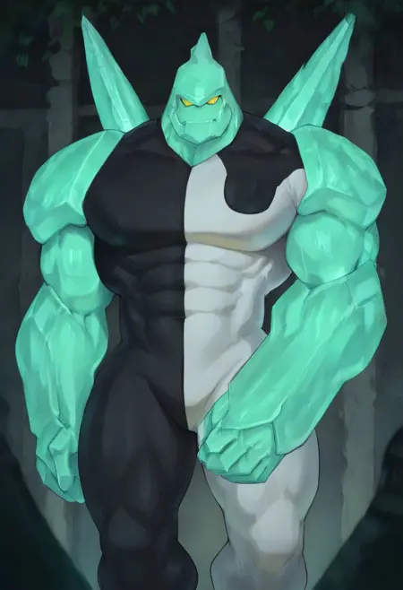 Diamondhead, alien, yellow eyes, no pupils, no nose, turquoise skin, diamond body, big hands, black and white spandex, sharp body,