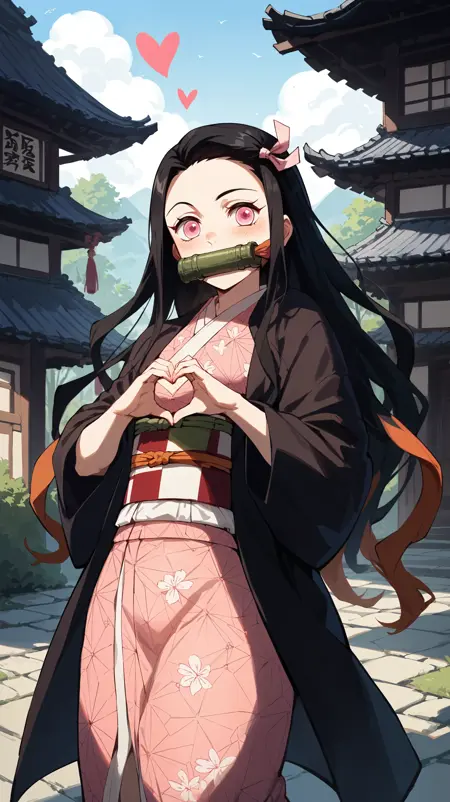 aNezuko, long hair, black hair, pink eyes, bit gag, bamboo gag, pink kimono, black coat