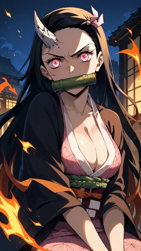 bNezuko, long hair, black hair, pink eyes, single horn, veins, cracked skin, cleavage, fangs, pink kimono, black coat