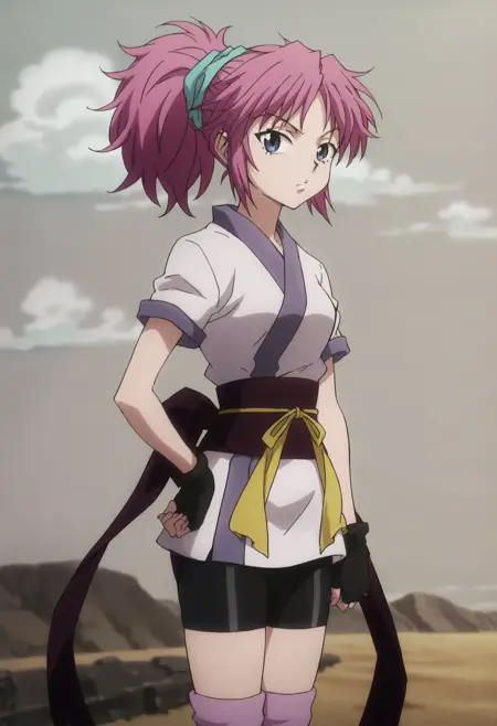 언더컷, 짧은 머리, 일본식 복장, 자전거 반바지, 검은 손가락 없는 장갑, 레그 워머, 허리띠, 머리 띠