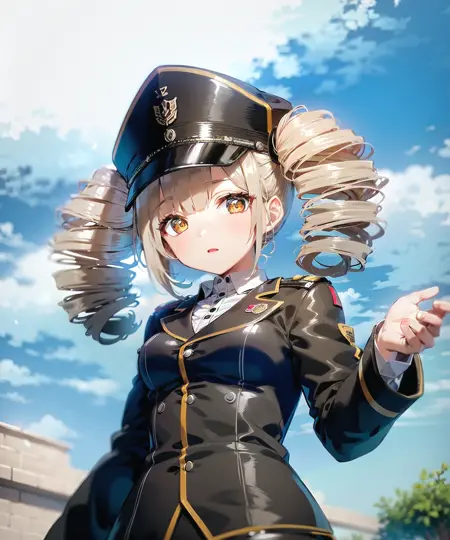 1girl, shirotof, ブロンドヘア, ドリルヘア, ツインテール, ブラウンアイ, バングス