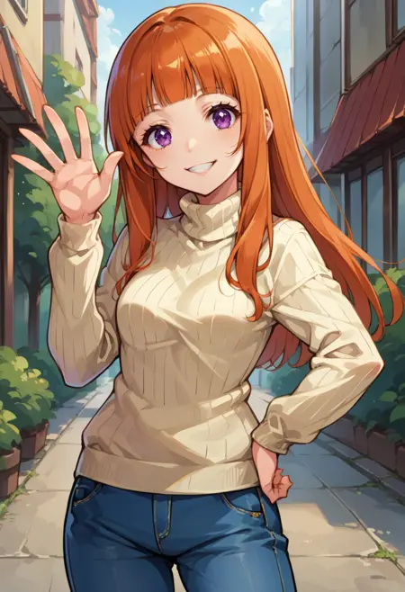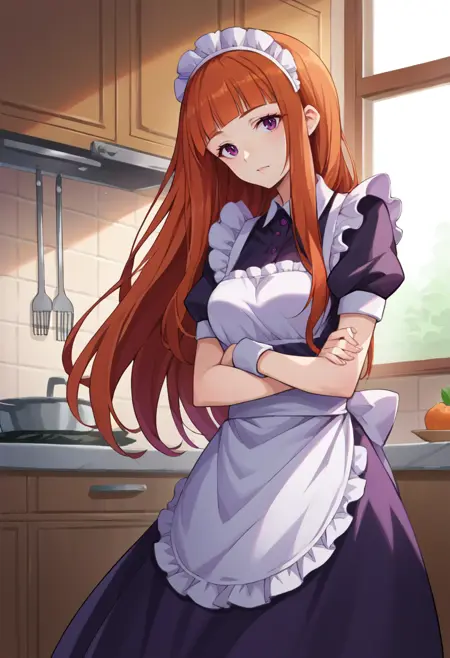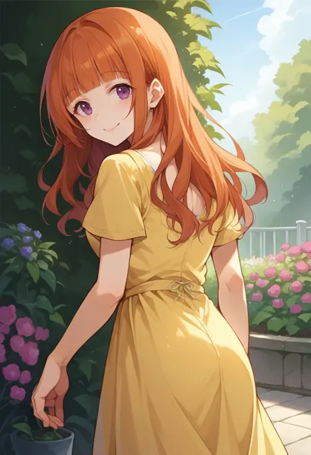 AnjuYuuki, purple eyes, orange hair, long hair, blunt bangs