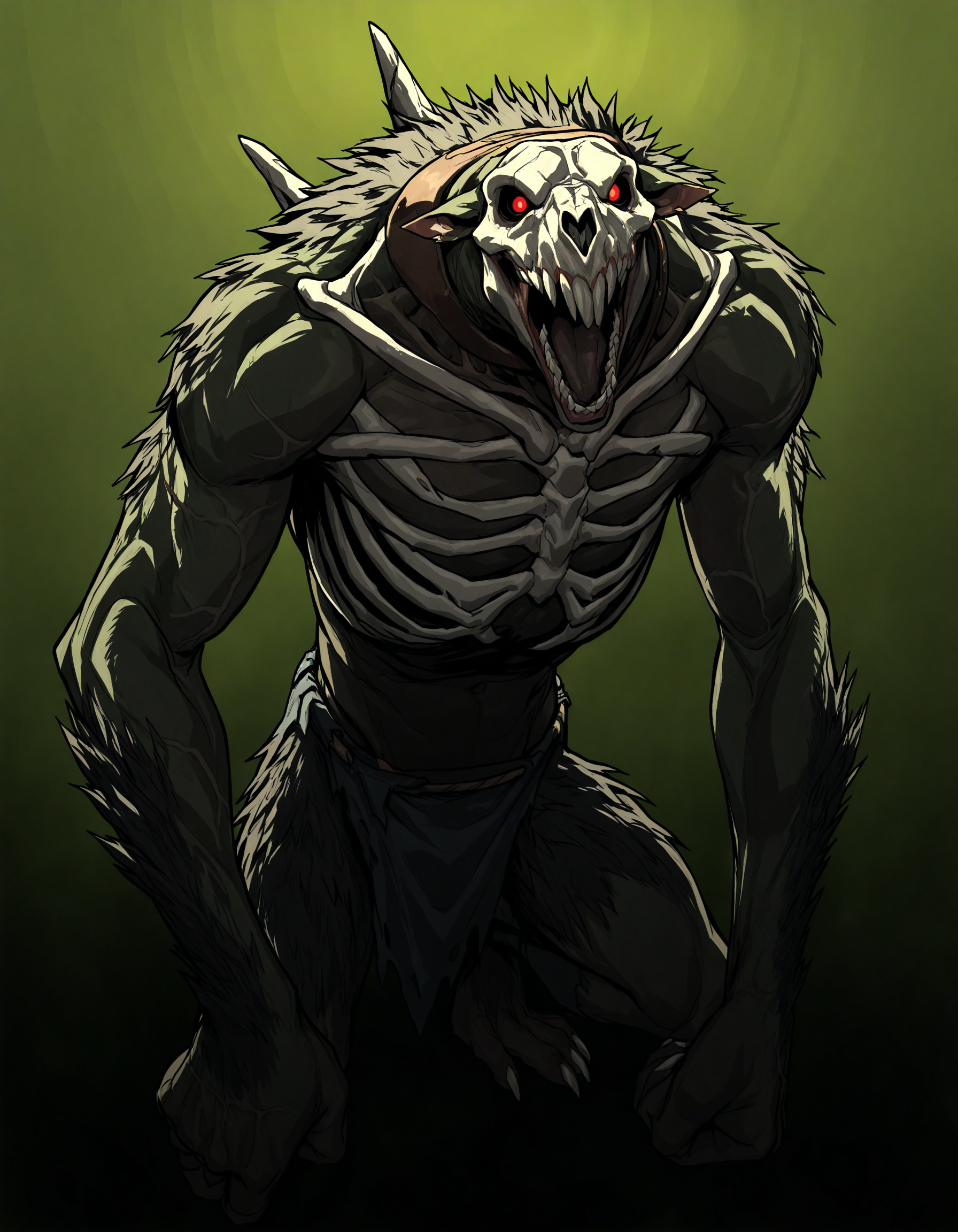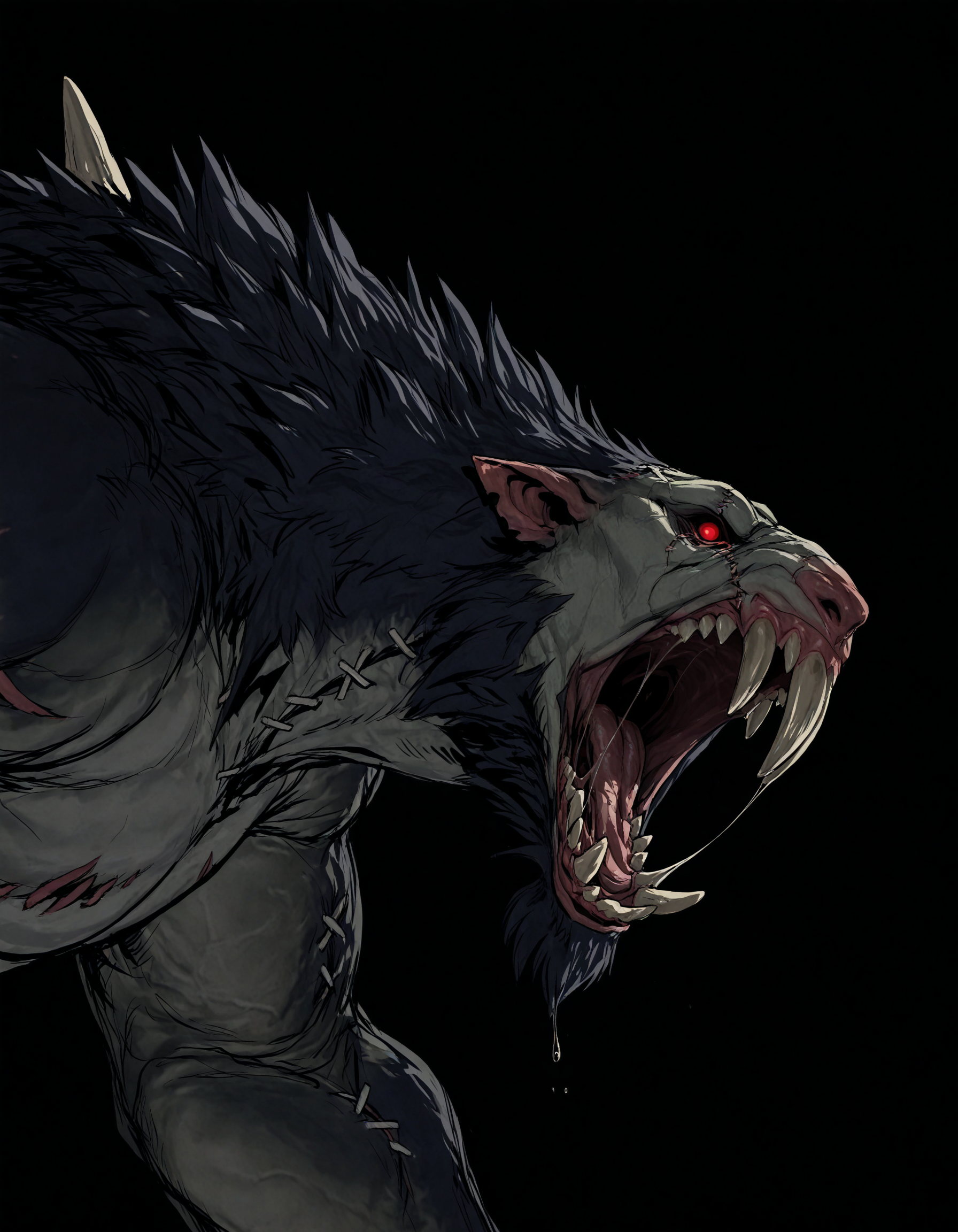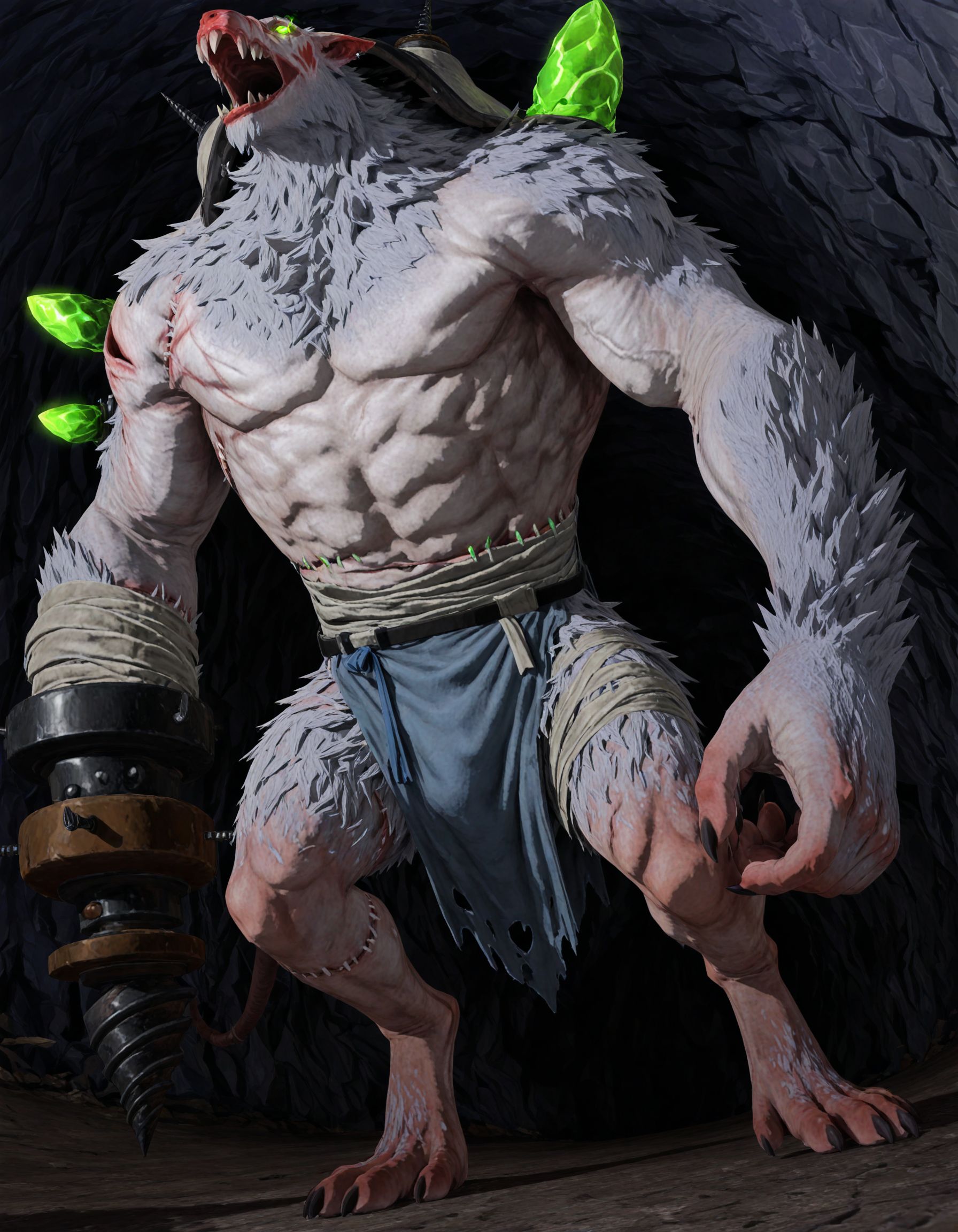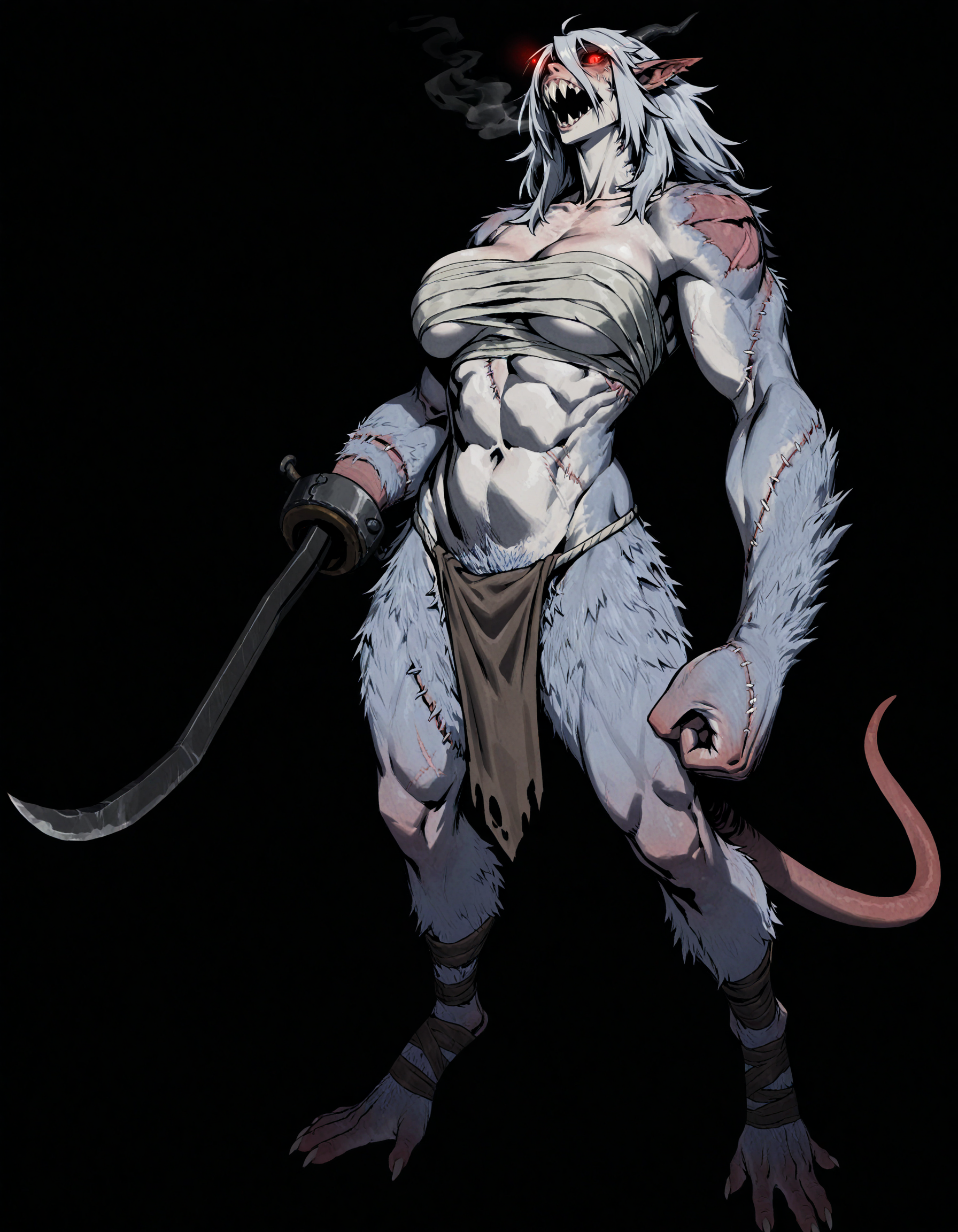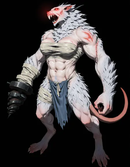 RatOgre, white fur, stitches, scars, exposed skull, bloody, prosthetic weapon,