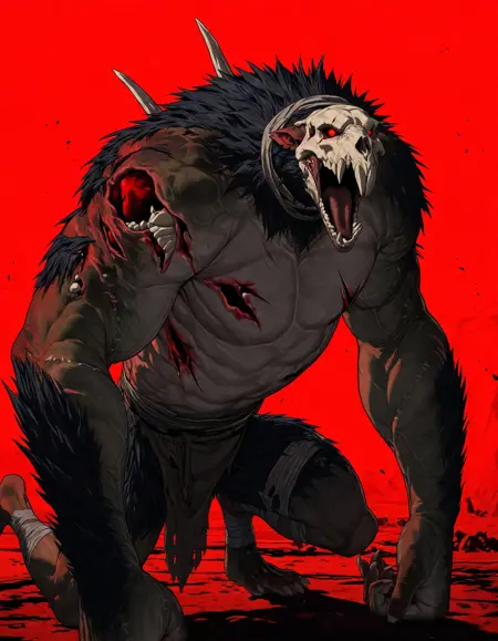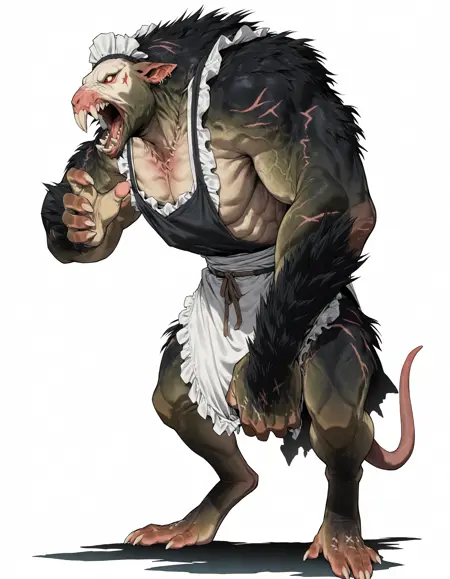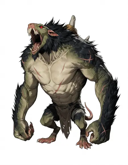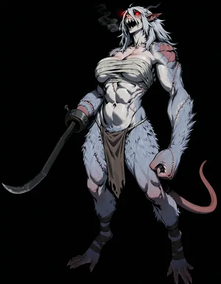 RatOgre, brown fur, stitches, scars, bandages, belt, prosthetic weapon,