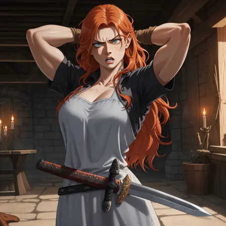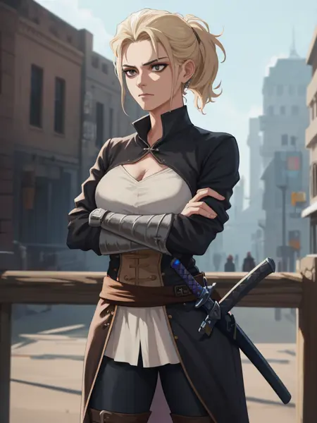 추가로 "arms up" 또는 "crossed arms"도 사용하는 것이 좋습니다. 그렇지 않으면 캐릭터가 보호장치를 쓴 검을 들어서 생성될 가능성이 높습니다.