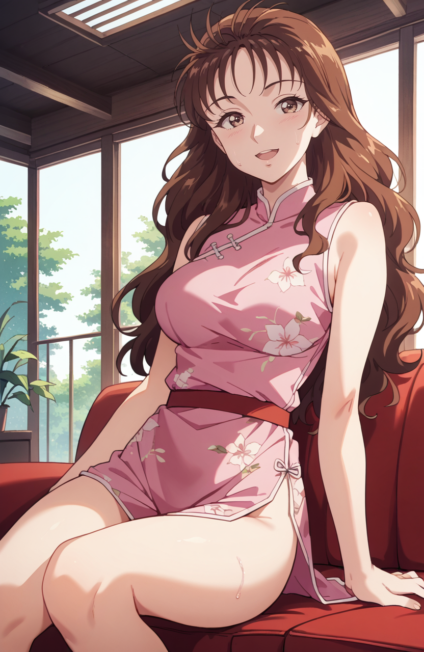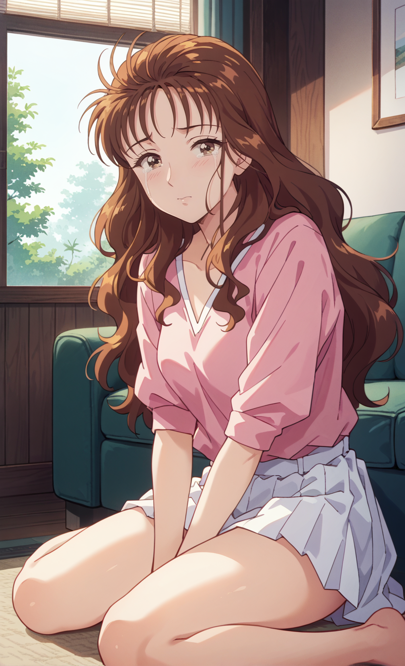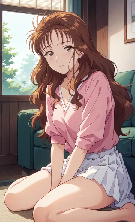 ,long hair,brown eyes,brown hair,indoors,room,pink shirts,white skirt,smile, lora:KindaichiSaotomeRyouko4thtail:1