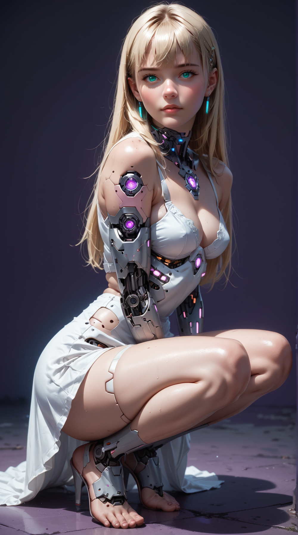 以下の要素を使ってシナリオに参加します:**reij-cybrwrdrbdrss05、白いサイバースーツ、白いスカート、紫の帽子、サイバーカーの詳細、チョーカー、ブラックのヒール