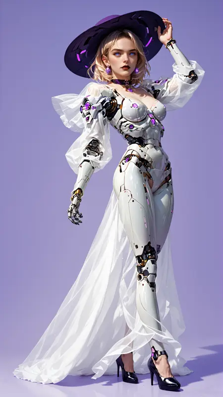 다음 항목을 사용하여 시나리오에 참여: reij-cybrwrdrbdrss05, 흰색 사이버 슈트, 흰색 치마, 보라색 모자, 사이보그 바디 디테일, 촐커, 검은 하이힐
