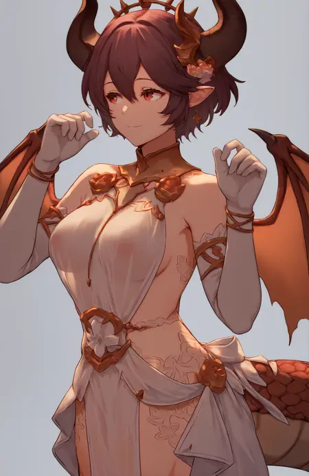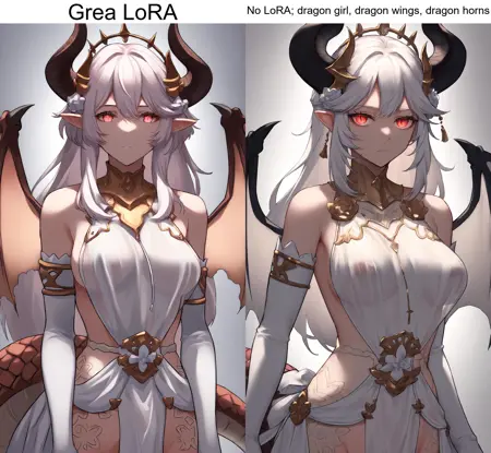 このLoRAは、dragon girl, dragon horns, dragon wings, dragon tail, を使用することで、私のGrea LoRAなしでGreaを再現できます(差異はそれほど大きくありません。私のLoRAは髪型、角の形状、尾にわずかに助けになります)。これらの要素が不要な場合は、否定文に含めてください。