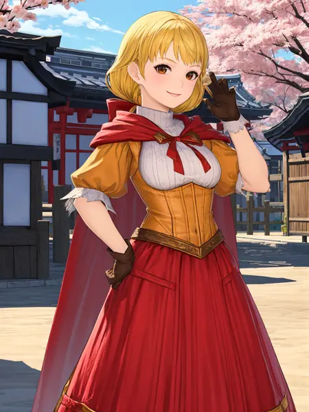 orange dress, red skirt, red cape, red ribbon, gloves, brown gloves, red skirt, long skirt