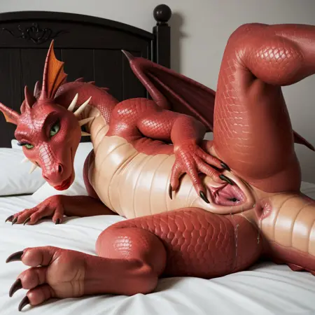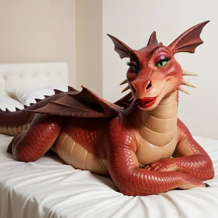 Additional prompts: dragon, wings, makeup, lipstick, head spikes, head fins, red scales, scales, 1girl, green sclera, green eyes, tail