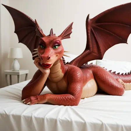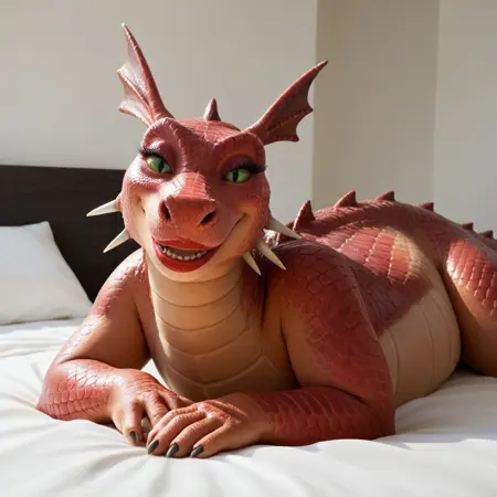 Additional prompts: dragon, wings, makeup, lipstick, head spikes, head fins, red scales, scales, female, 1girl, green sclera, green eyes, tail