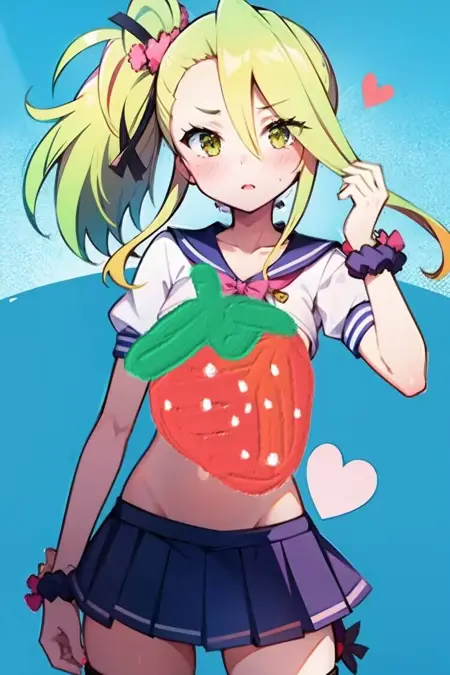 fa国服装的tag:school uniform, skirt, breasts, navel, scrunchie, blush, heart pasties, serafuku, pleated skirt, sailor collar