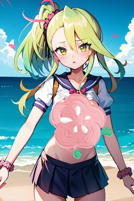 FA国服装标签:school uniform, skirt, breasts, navel, scrunchie, blush, heart pasties, serafuku, pleated skirt, sailor collar