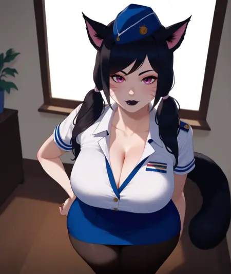 cotton_canoodle,miqo'te, 1girl, 黒い唇, 尾, 大きな胸, 猫の耳, 黒髪, 広いヒップ, 厚い太もも, ツインテール, リップスティック, 長髪, 猫の尾, ピンクの目, 笑顔, 黒い爪, もふもふした尾,