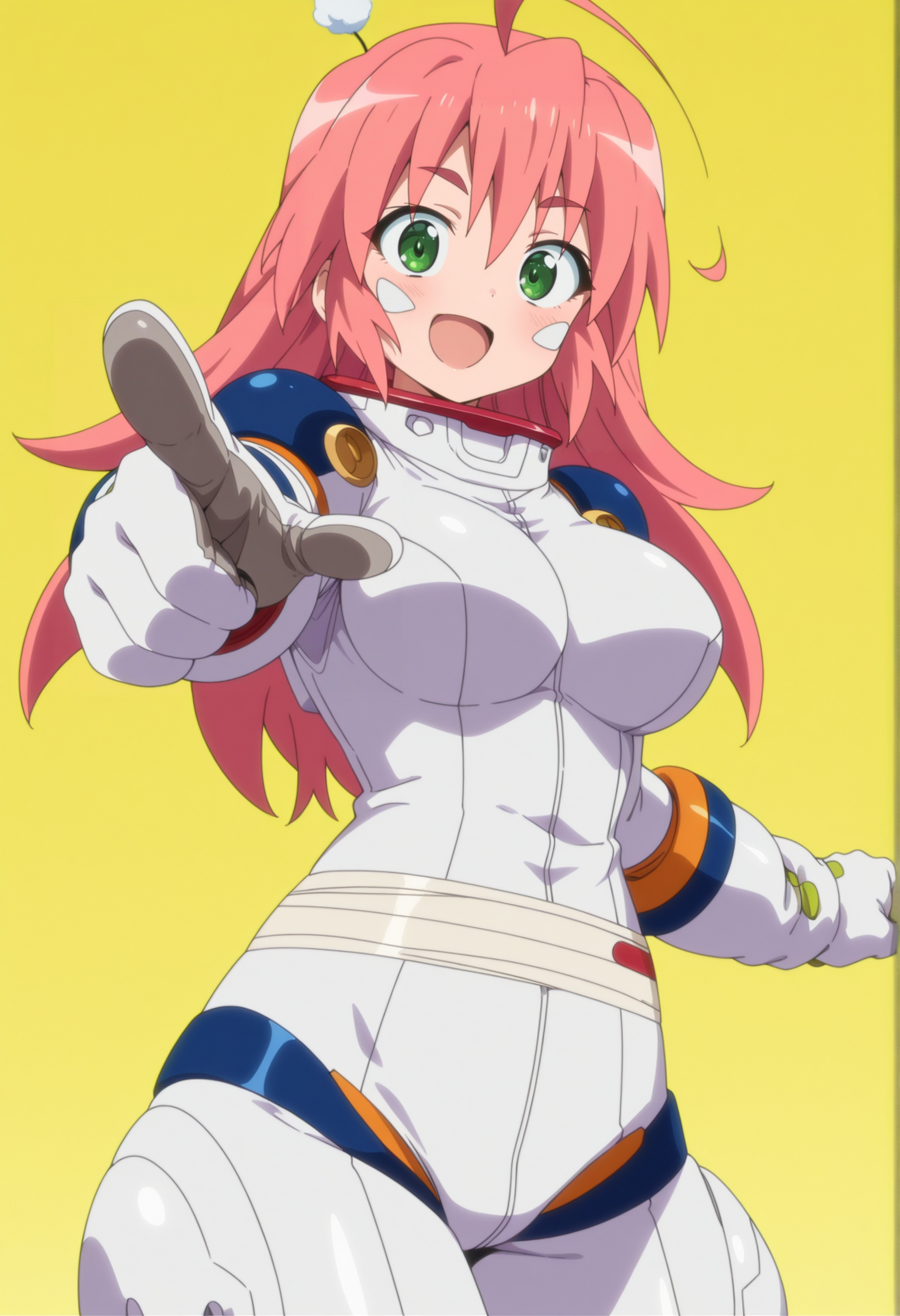 anime screencap, long hair, pink hair, green eyes, ahoge, pom pom hair ornament, facial mark, white bodysuit, spacesuit