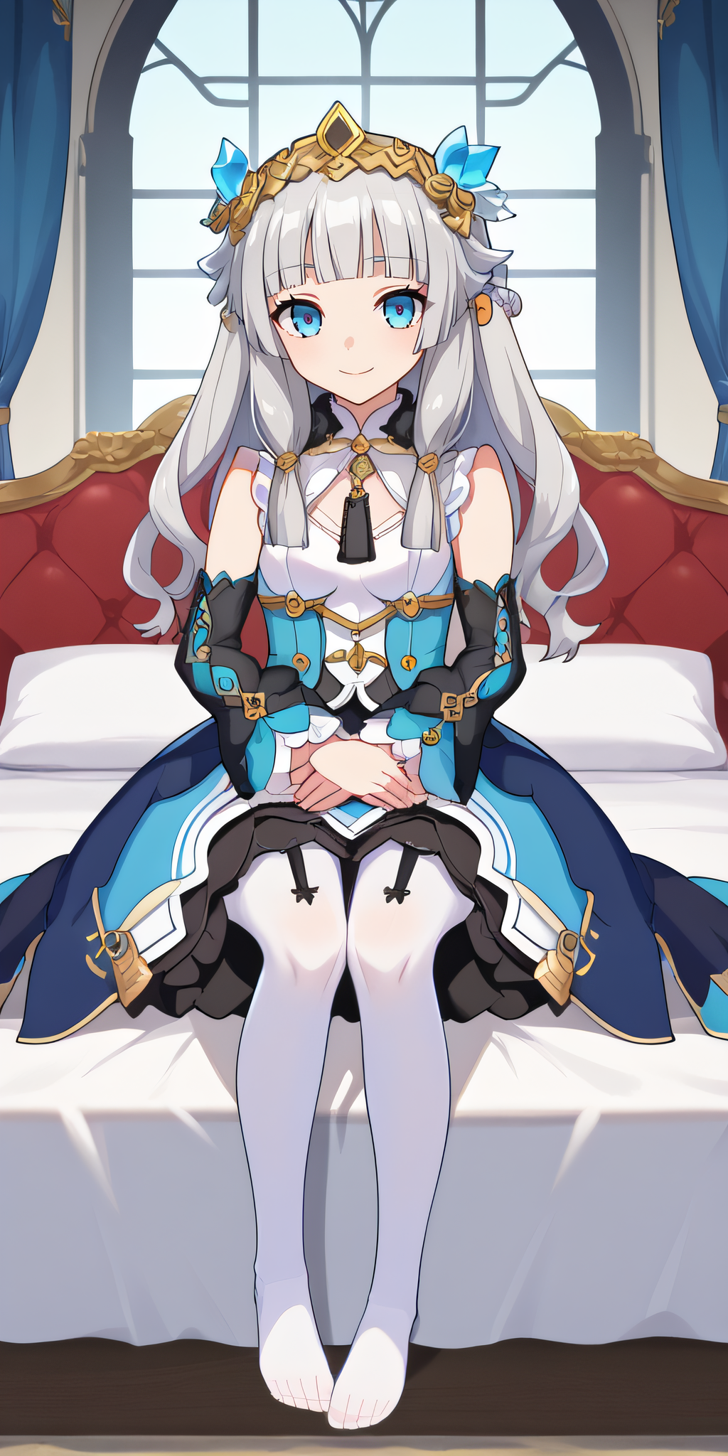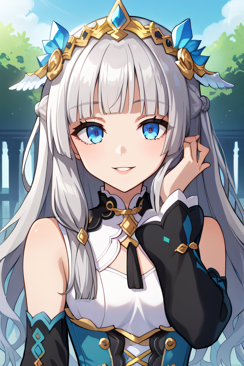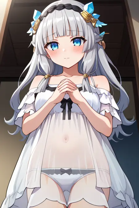 beatrice, long hair, grey hair, sidelocks, blue eyes, blunt bangs, hair ornament
