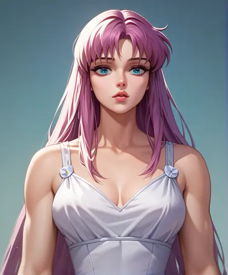 1girl, solo, athena, saori, purple hair, blue eyes, makeup, lipstick, pink lips,