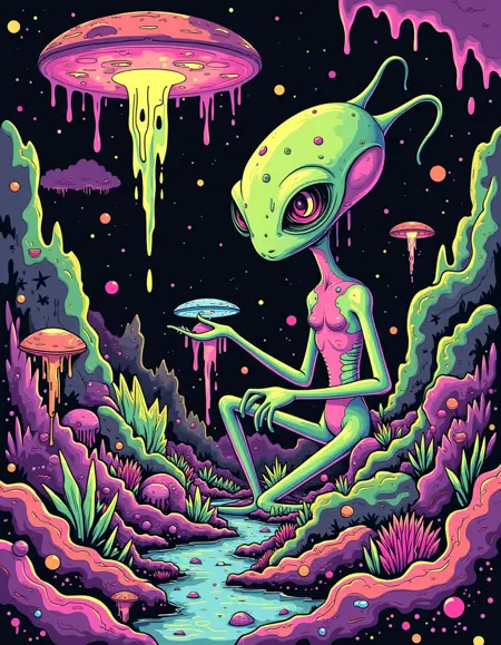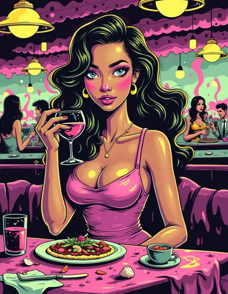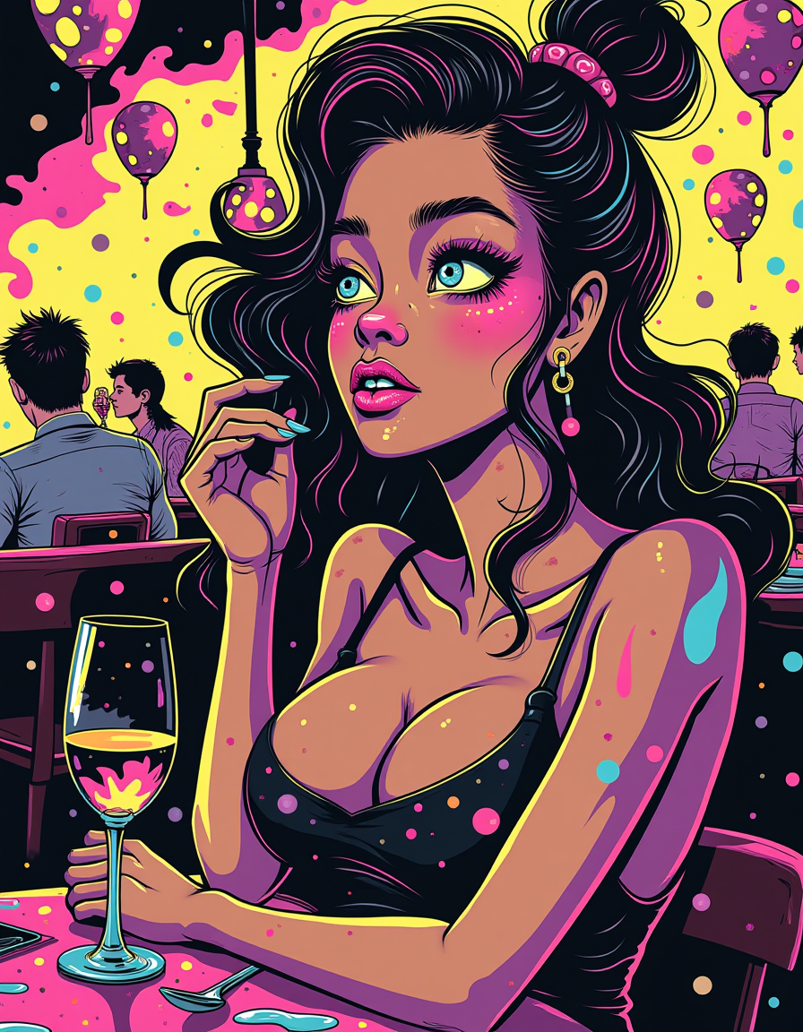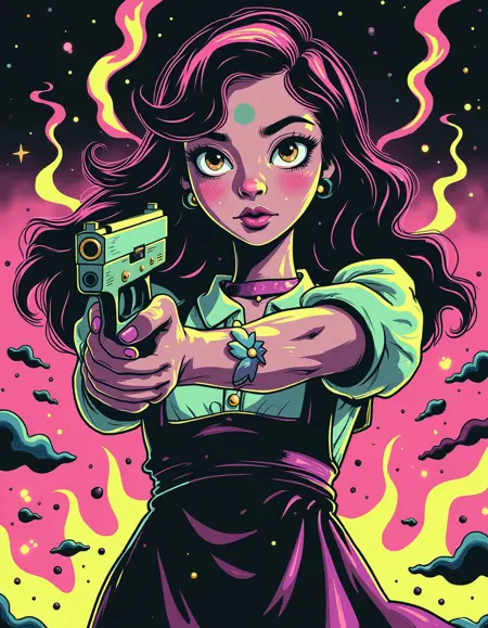 "기묘한" 스타일은 전자적인 톤, 즉 네온 핑크, 블루, 옐로우를 포함한 대담하고 환각적인 색상 팔레트로 특징지어집니다. 시각적 요소는 종종 과장되며, 날카로운 대비와 두꺼운 검은 윤곽선이 작품에 강렬함과 초현실성을 부여합니다. 이 스타일은 팝 아트와 만화 아트의 요소를 융합하며, 스타일리시한 표정과 생동감 넘치며 마치 초월적인 듯한 조명을 강조합니다. 구성은 왜곡되거나 과장된 비례를 자주 사용하여 혼란스러움이나 강화된 현실감을 창출합니다. 이 스타일은 역동적이고 에너지 넘치며 비전통적인 미학을 수용하며, 대체 또는 초현실적인 차원의 느낌을 불러일으킵니다.