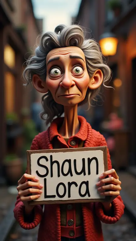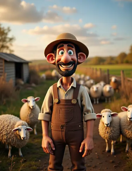 The "Shaun The Lora" style is playful and reminiscent of claymation, characterized by a whimsical, soft, and approachable design. The figures have a tactile, handmade appearance with rounded forms and exaggerated, almost cartoonish features that evoke a sense of charm and innocence. The environments are vibrant and idyllic, with pastoral, countryside landscapes filled with bright, natural colors. The lighting is soft and diffused, creating a warm, inviting atmosphere. Despite the stylized, simplified details, there is an emphasis on texture, particularly in the wooly, curly surfaces. No copyrighted images were used in training this style.