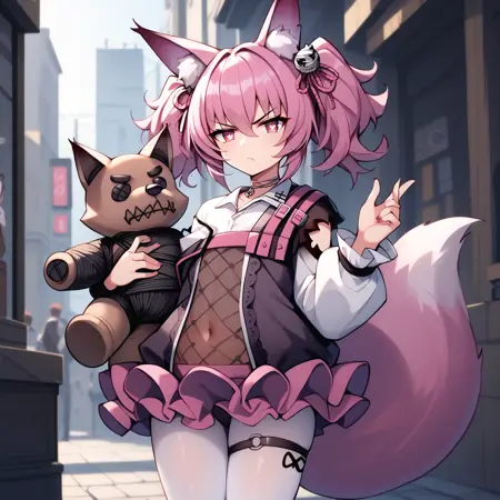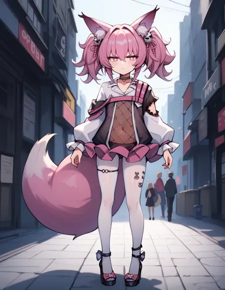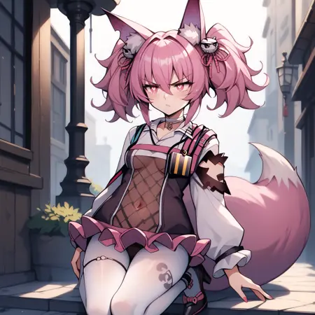 animal_ears, animal_ear_fluff, fox_ears, twintails, pink_hair, fox_girl, tail, fox_tail, hair_between_eyes, hair_ornament, pink_eyes, symbol-shaped_pupils,