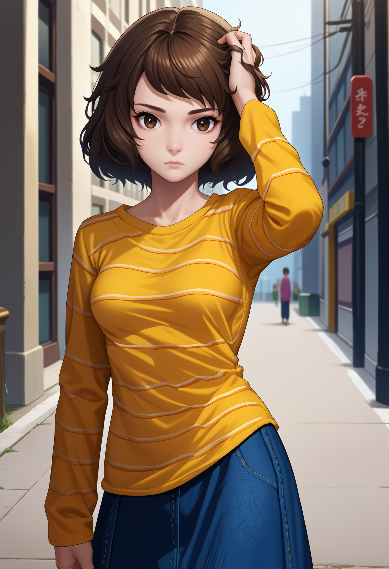 デフォルトの服装: saday0def, 短い髪, 茶色の髪, 茶色の目, 黄色のシャツ, 横縞シャツ, ゆったりしたシャツ, 長袖, 青いスカート, デニムスカート