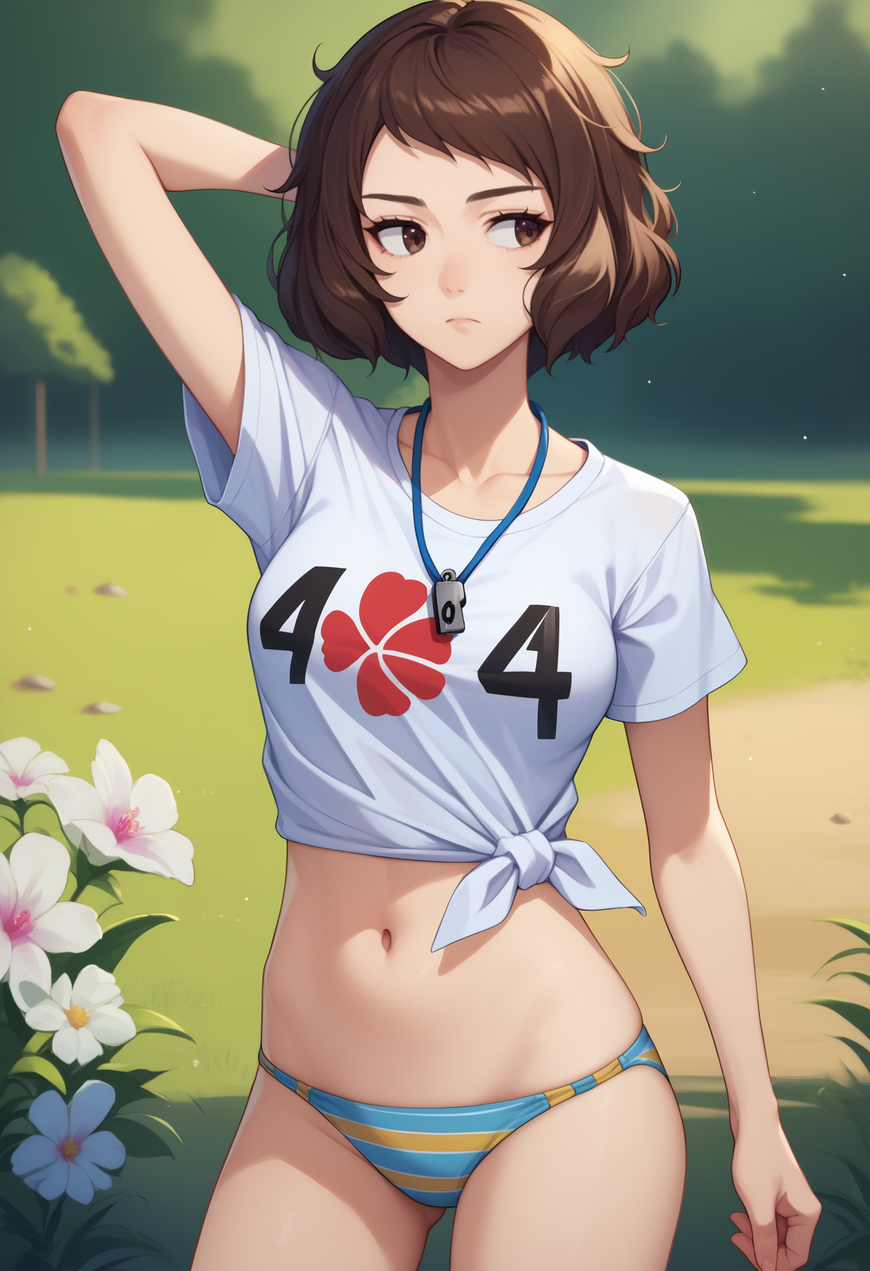ビキニ: saday0swim, 短い髪, 茶色の髪, 茶色の目, 白いシャツ, Tシャツ, 結んだシャツ, プリントシャツ, 衣服に書かれた文字, 横縞ビキニ, ビキニの下のみ, 锁骨, へそ