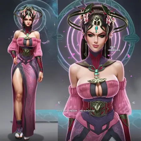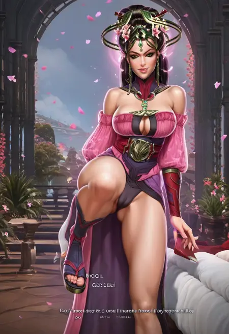 ThaisSF, 1소녀, 싱글, 여신, 구름, 검은 머리, 긴 머리, 머리 꽃, 머리 장식, 녹색 눈, 두꺼운 입술, 분홍색 입술, 귀걸이, 메이크업, 목걸이, 큰 가슴, 보석, 젖가슴 노출, 긴 분홍색 드레스, 벨트, 어깨 노출, 절개 드레스, 젖가슴 절개, 넓은 소매, 두꺼운 허벅지, 꽃, 타비, 꽃 무늬, 흰 속옷, 흰 양말,