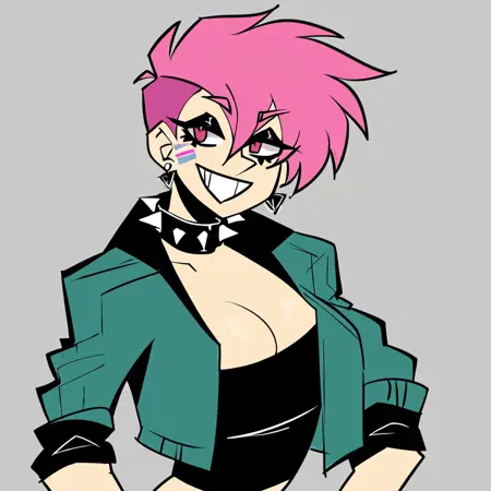 사용법: "1girl, solo, enbie girl, smile, short hair, undercut, pink hair, black shirt, tank top, cleavage, (옵션) spiked collar, earrings, blue jacket, open jacket, jeans, black boots"