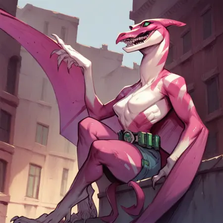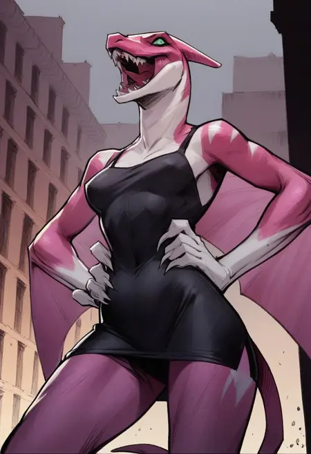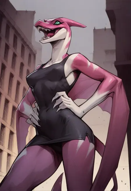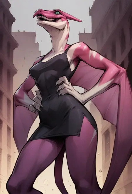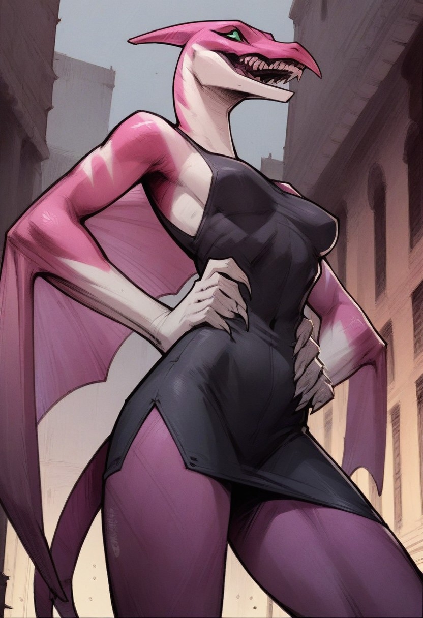 EDIT: Was asked to have a try at a version 2 on this. I'm not sure it's much different to be honest, but here it is. Tags for this one are: "PMPR, furry female, pterodactyl, pink skin, multicolored skin, wings, tail, sharp teeth, claws, green eyes, colored sclera, medium breasts, belt".