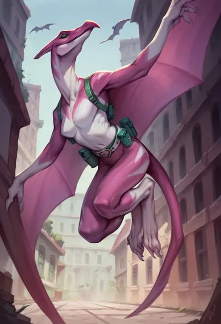 タグは「Pink_MPR、フューリーな女性、プテロダクティル、多色の肌、爪、鋭い歯、ピンクの翼、緑の目、尾、ベルト」です。