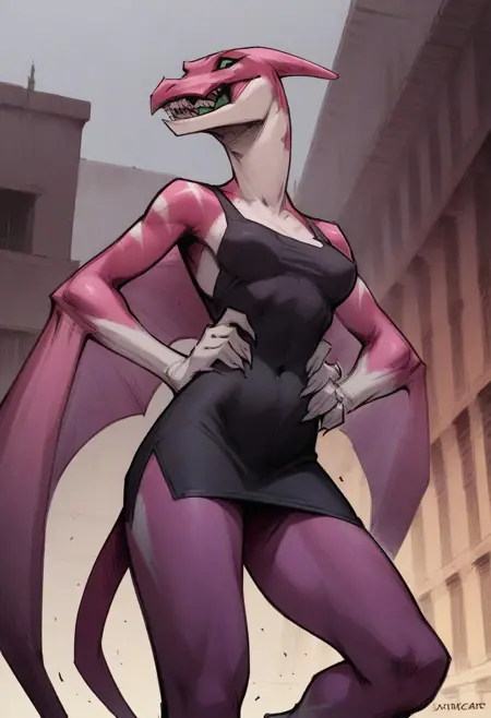 EDIT:バージョン2を試してみるように依頼されました。正直、それほど違いがないと思いますが、以下に示します。このバージョンのタグ:「PMPR、フューリーな女性、プテロダクティル、ピンクの肌、多色の肌、翼、尾、鋭い歯、爪、緑の目、彩色された巩膜、中程度の胸、ベルト」。