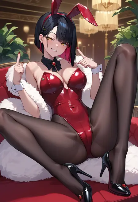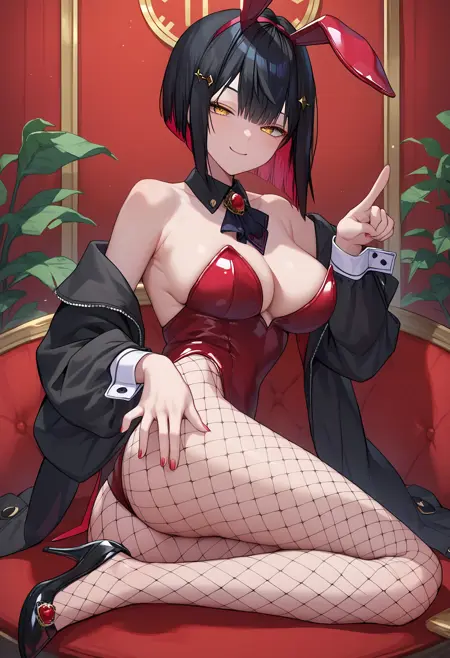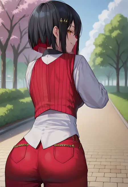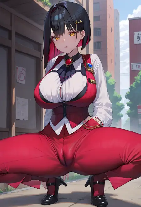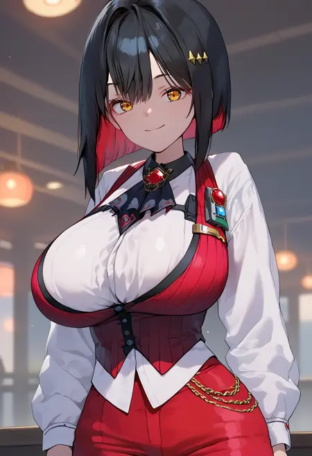 shirogue, black hair, colored inner hair, yellow eyes, short hair, hairclip, bob cut, huge breasts, ascot, brooch, red vest, red pants,