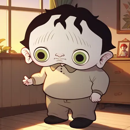 - m-melvin, grey skin, gnome, 1boy, solo,